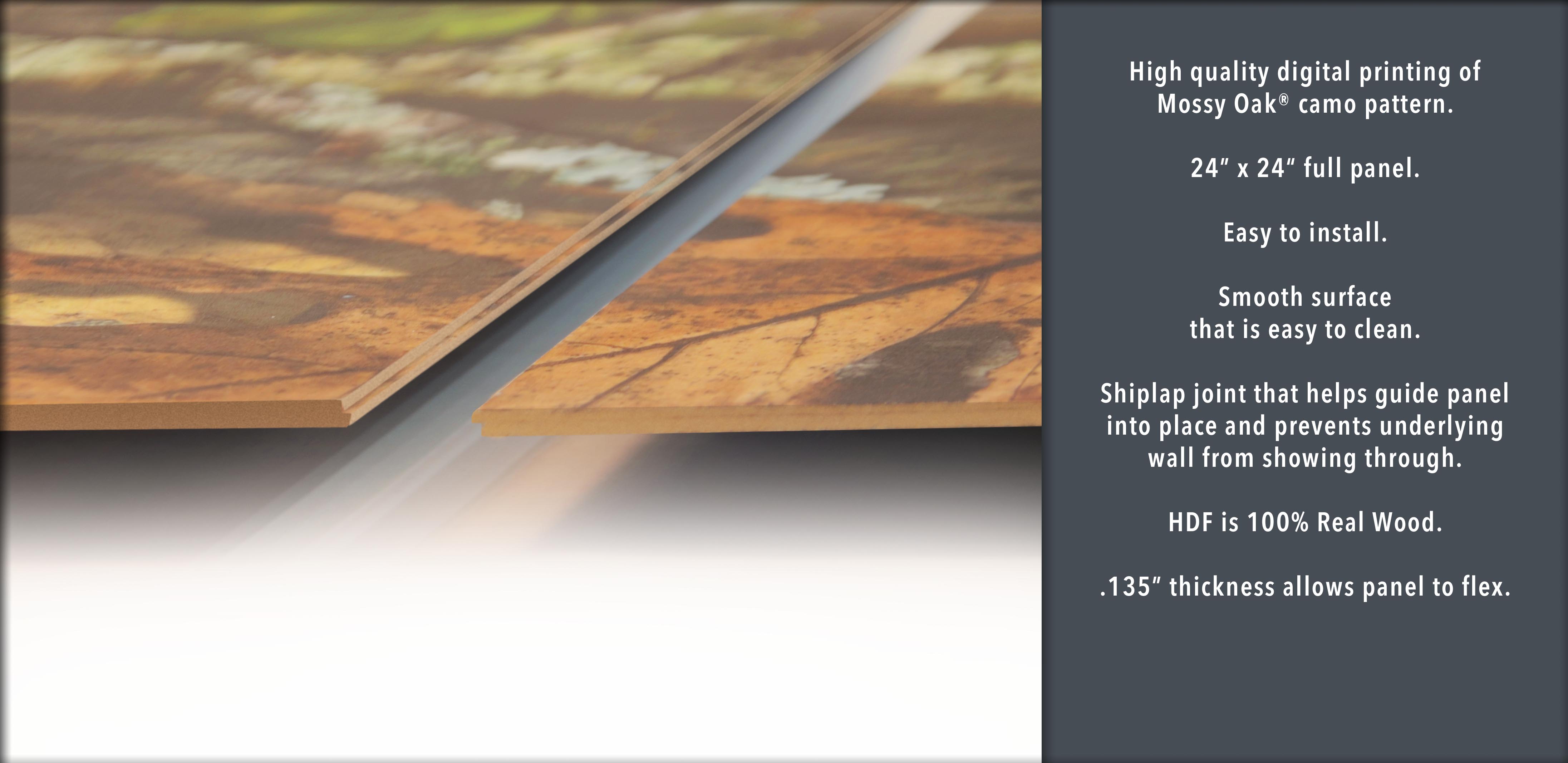 Wallpanels are easily mounted to any wall or celling with a quick application of a construction adhesive. Installation is made simple with our interlocking panel system that makes it easy to install in an afternoon, resting assured that the panels are straight and on your surface for good. In no time your space will be filled with Mossy Oak camo.